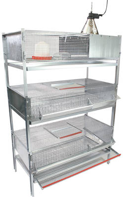 - une cage éleveuse (c'est une cage avec un côté fermé et un réflecteur pour obtenir une température d'environ 35°C, elle est destinée aux cailleteaux)
